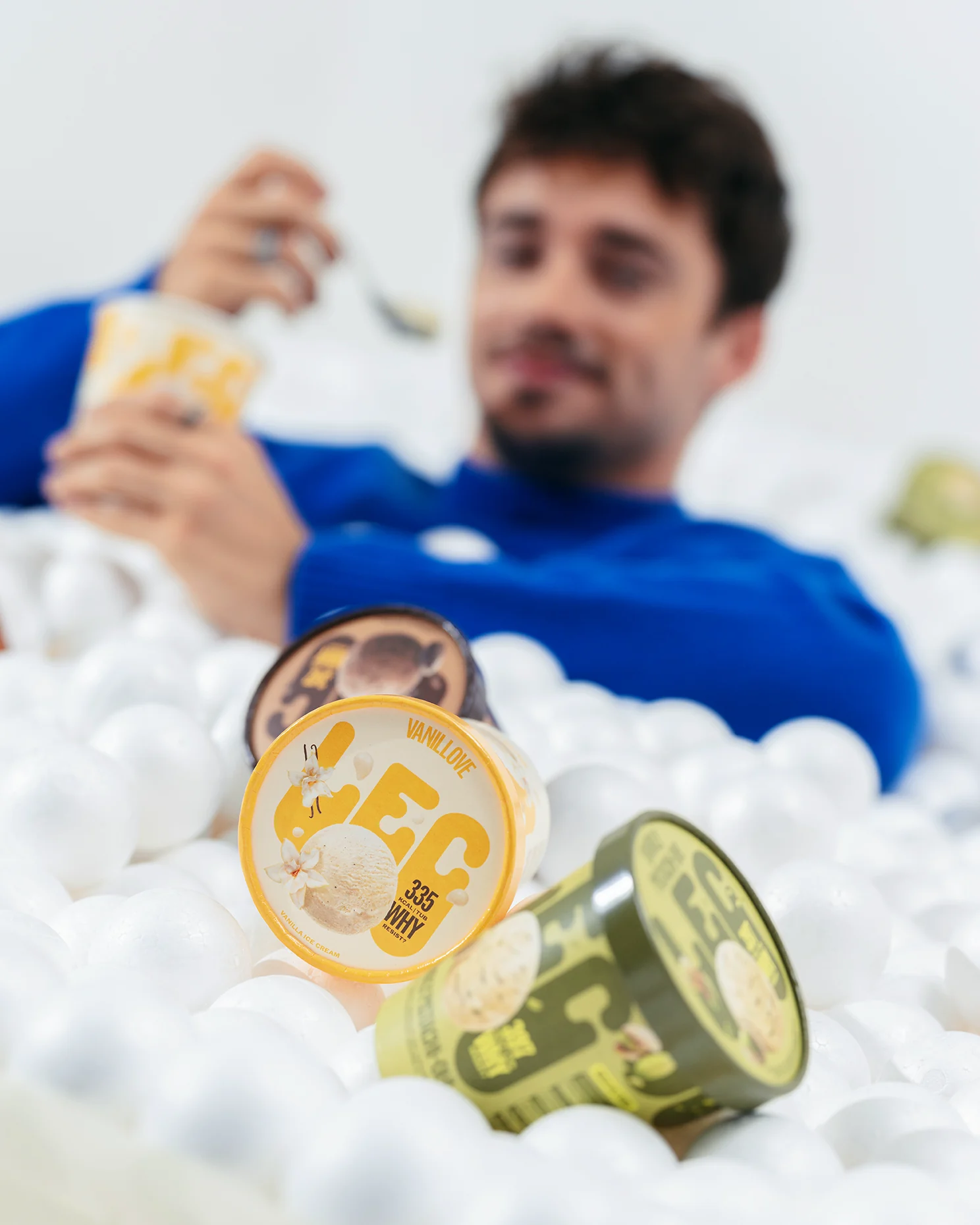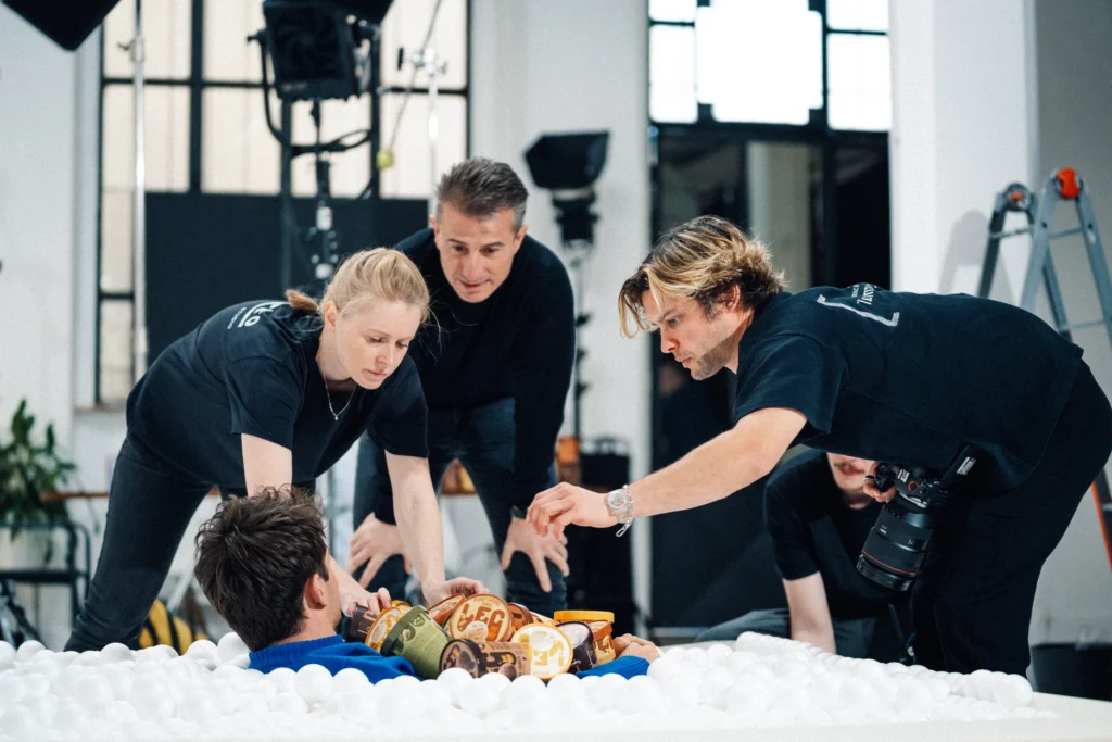 From the playful “ice cream ball pit” to a wall covered with 800 individually glued ice cream packs, each set was tailored to fit the agency vision. They also provided the perfect backdrop for the creators working simultaneously—Antoine (cognome) for the lifestyle photography, Julien (cognome) for the video content, and us on more commercial shots.